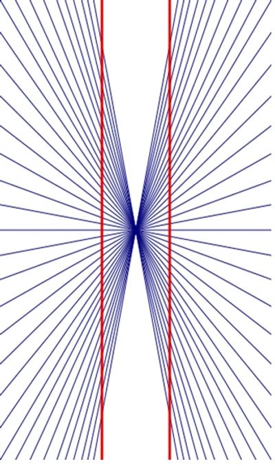 The Hering illusion is an optical illusion discovered by the German physiologist Ewald Hering in 1861. The two vertical red lines are both straight, but they look as if they were bowing outwards.